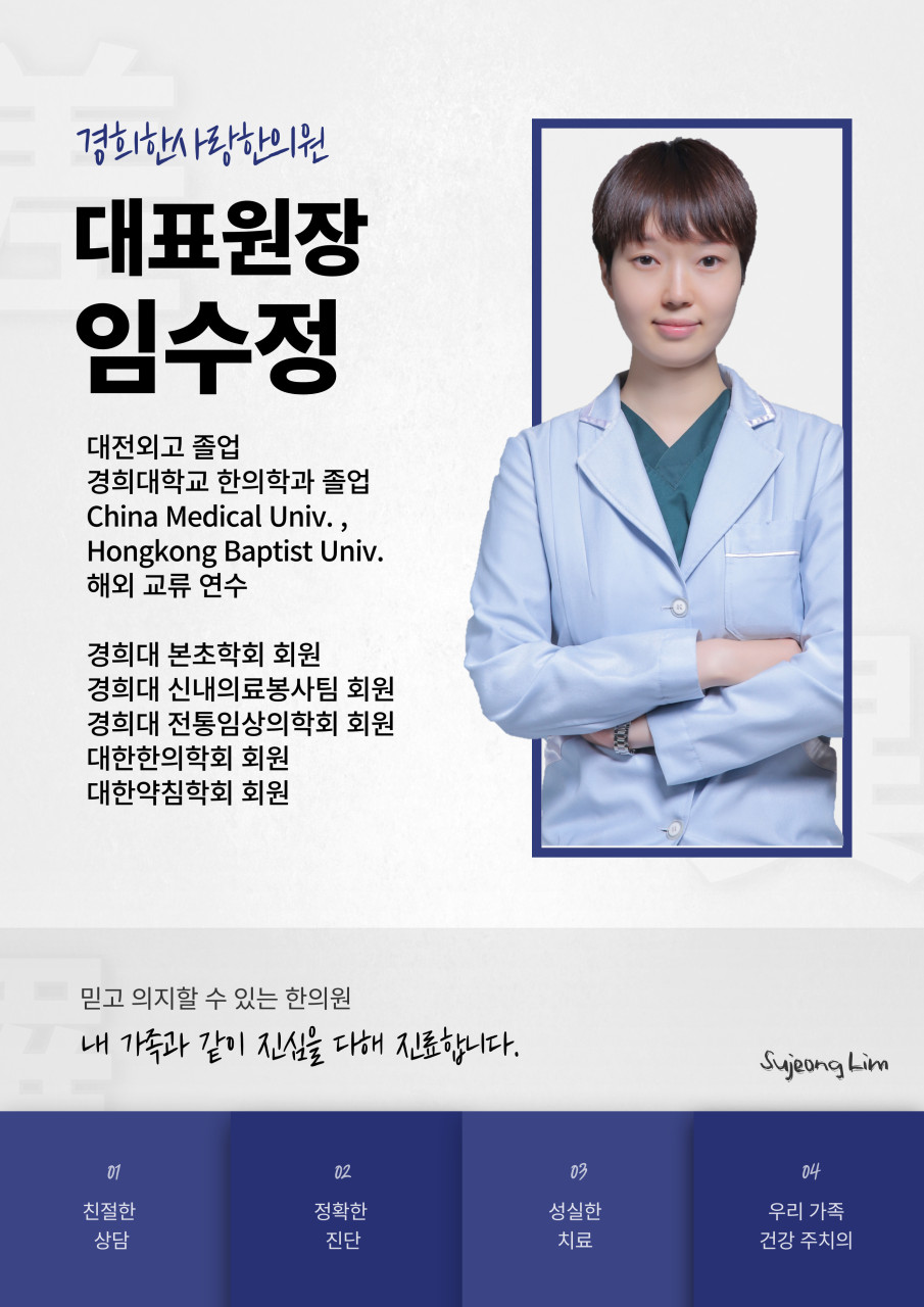 - 주소 : 충남 천안시 서북구 봉정로 362 2층 경희한사랑한의원